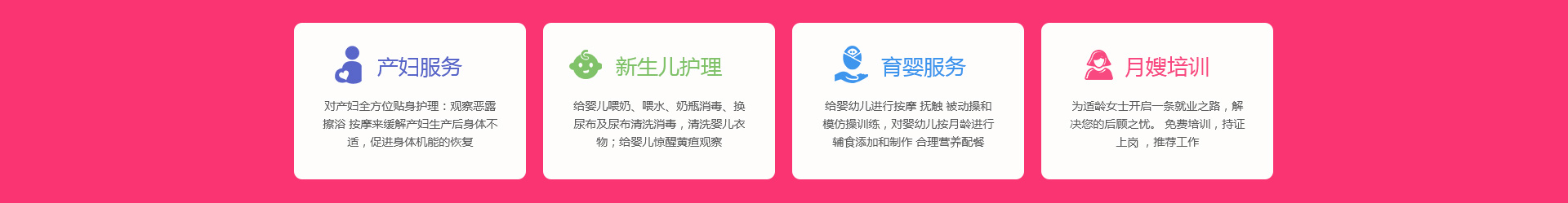 關(guān)于我們 產(chǎn)婦服務(wù) 新生兒護(hù)理 育嬰服務(wù) 月嫂培訓(xùn) 催乳師培訓(xùn) 舒心家政 月子餐 資質(zhì)榮譽(yù) 服務(wù)案例